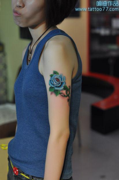 武汉专业纹身店:美女大臂时尚玫瑰纹身图案作品