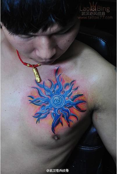武汉专业纹身店2013年最新作品展示:胸口彩色太阳纹身图案作品