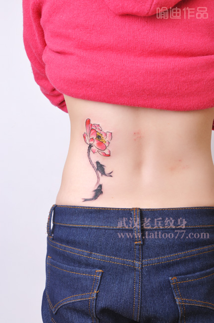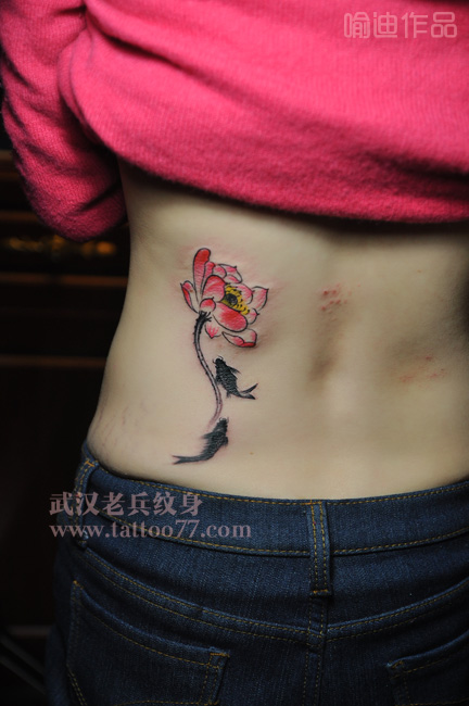 美女腰部水墨鱼莲花纹身由武汉最好纹身店打造