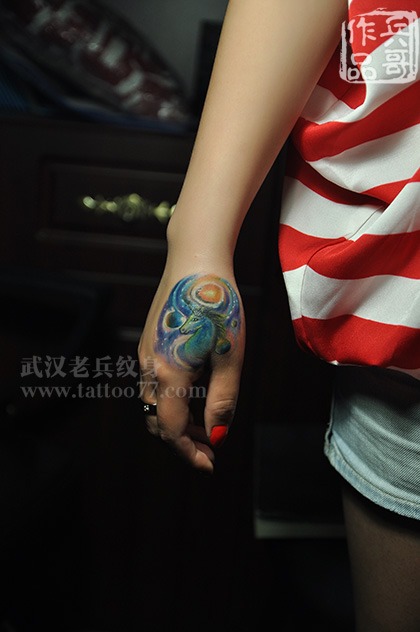 手部星空独角兽纹身由武汉最好纹身店老兵打造