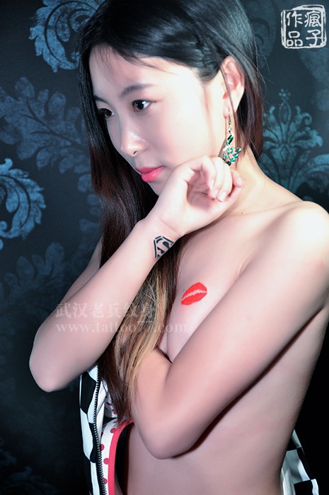 清纯小美女的胸部唇印手部超人标志纹身出自武汉最好纹身店