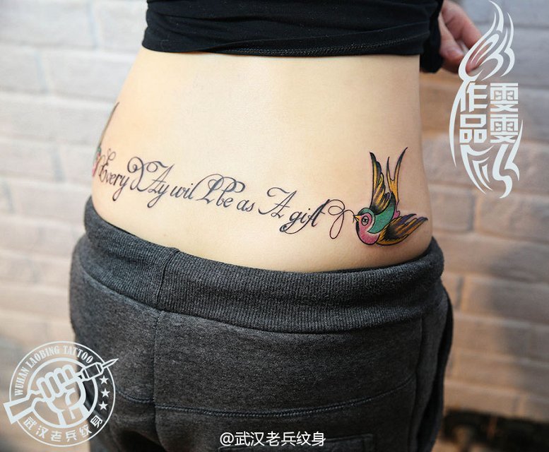 武汉最好纹身店打造的后腰小鸟文字纹身