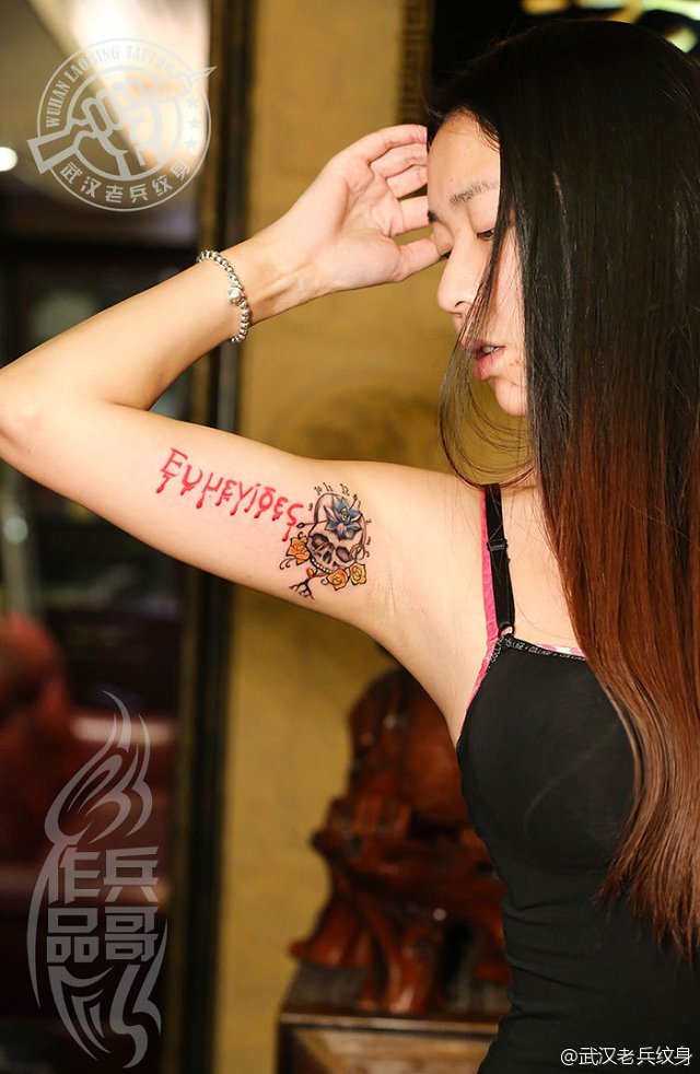 武汉最好纹身店为美女打造的手臂school骷髅纹身作品