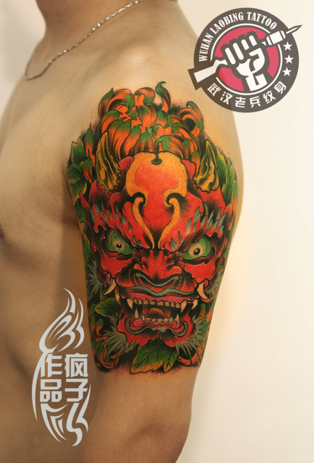 武汉最好纹身店打造的大臂彩色唐狮子纹身作品