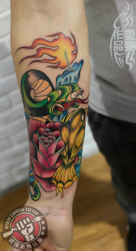 武汉最好纹身店打造的手臂SCHOOL蛇纹身作品