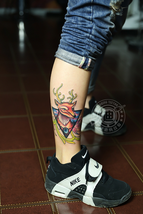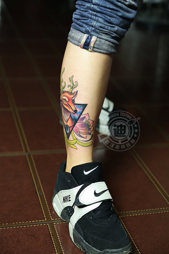 武汉最好纹身店打造的腿部星空鹿纹身作品