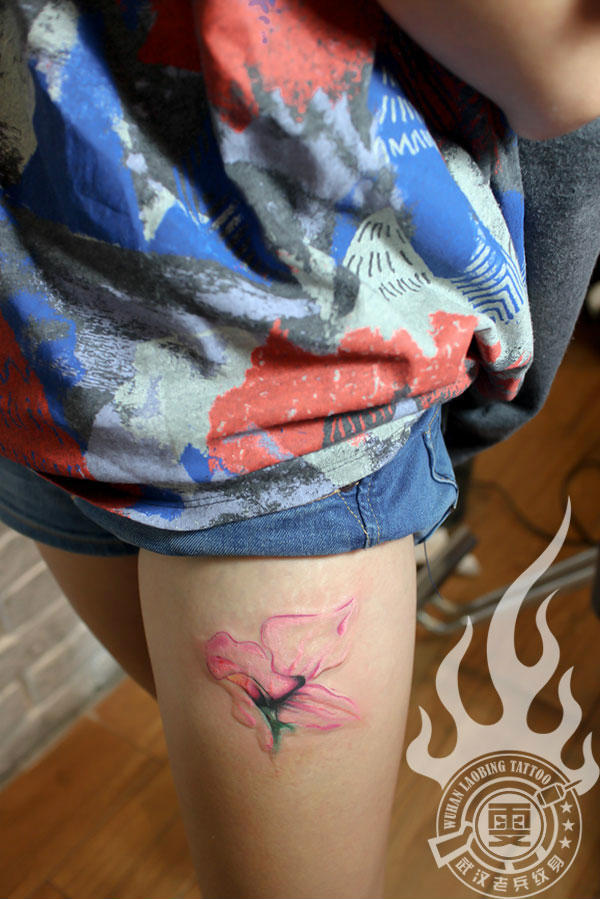 武汉最好纹身店打造的大腿水彩花卉纹身