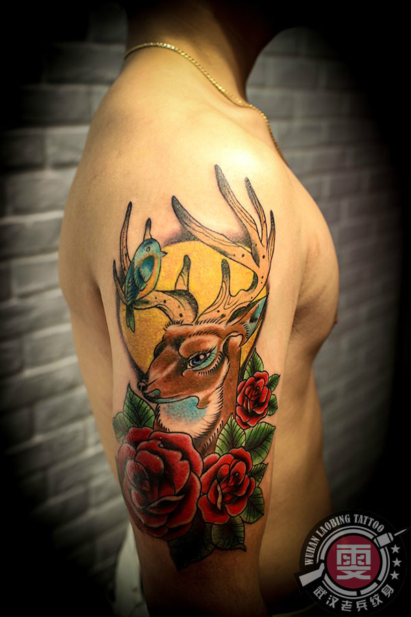 武汉最好纹身店打造的大臂SCHOOL鹿纹身作品