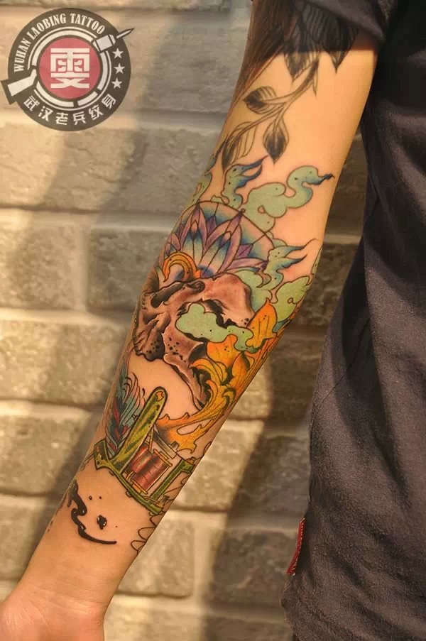 色彩泼墨小臂狮子纹身作品
