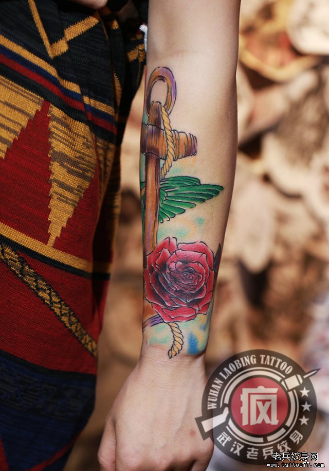 遮盖旧图--水彩船锚玫瑰纹身图案作品