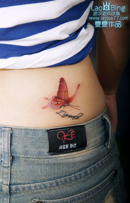 武汉纹身店:美女腰部彩色蝴蝶文字纹身作品