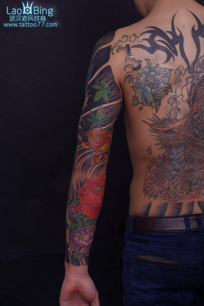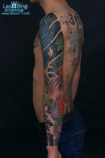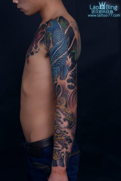 武汉专业纹身店:修改加新做--花臂半胛鲤鱼嘎巴拉纹身图案作品