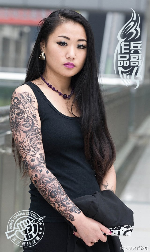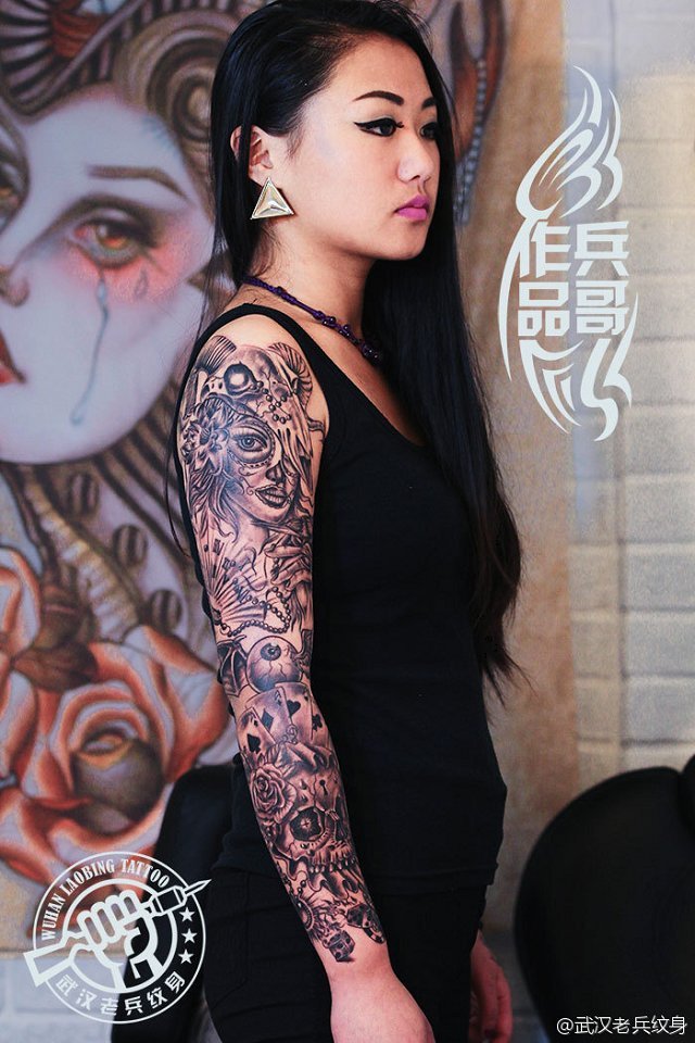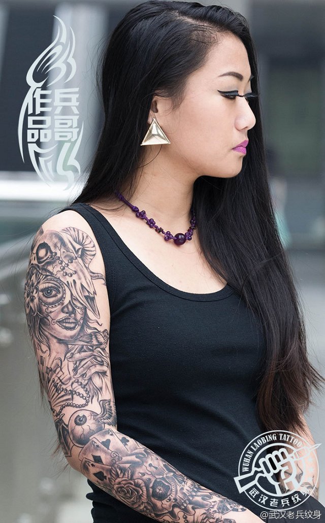 武汉专业纹身店为美女打造的时尚花臂纹身作品