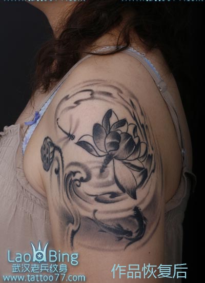 武汉专业纹身店:大臂水墨莲花鲤鱼纹身图案作品