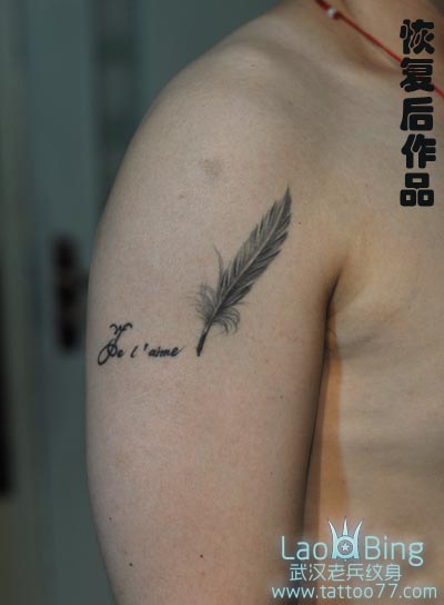 武汉专业纹身店:大臂羽毛文字纹身图案作品