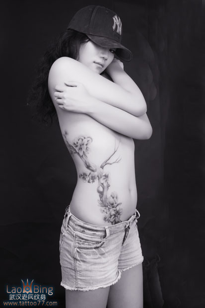 武汉专业纹身店:性感美女的腰部桃花树纹身图案作品恢复效果