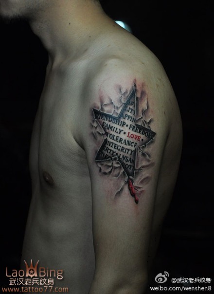 武汉老兵纹身打造的一款3D撕皮五角星文字纹身图案作品