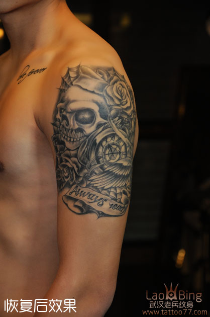 哪里纹身最好,武汉老兵纹身打造的大臂School骷髅纹身恢复效果