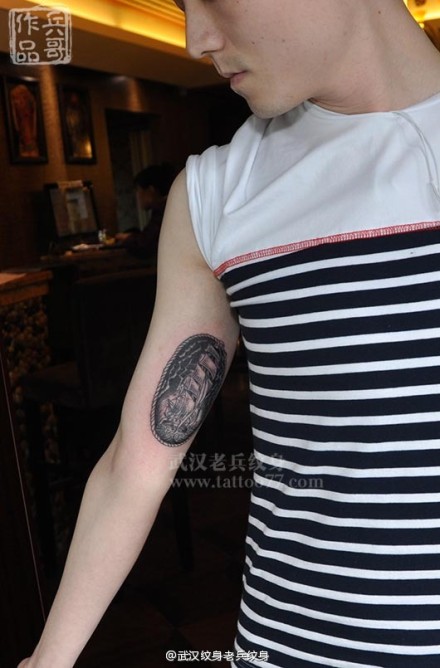 手臂帆船纹身由武汉最好纹身店老兵出品