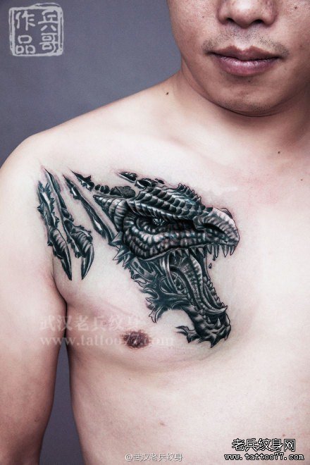 武汉最好纹身店打造的胸口3D欧美龙头纹身作品