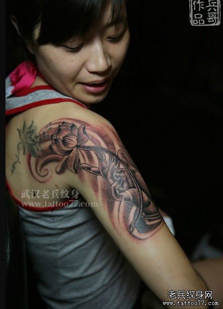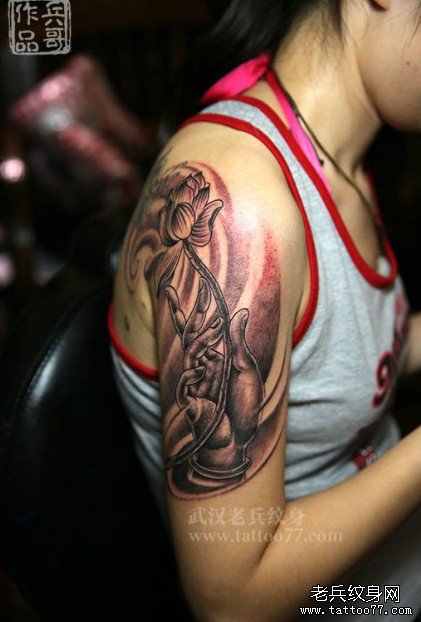 武汉最好纹身店打造的大臂佛手莲花纹身作品