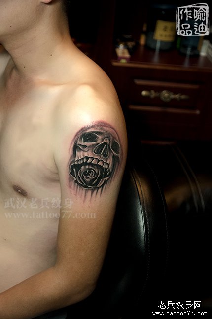 武汉最好纹身店打造的大臂骷髅玫瑰纹身作品