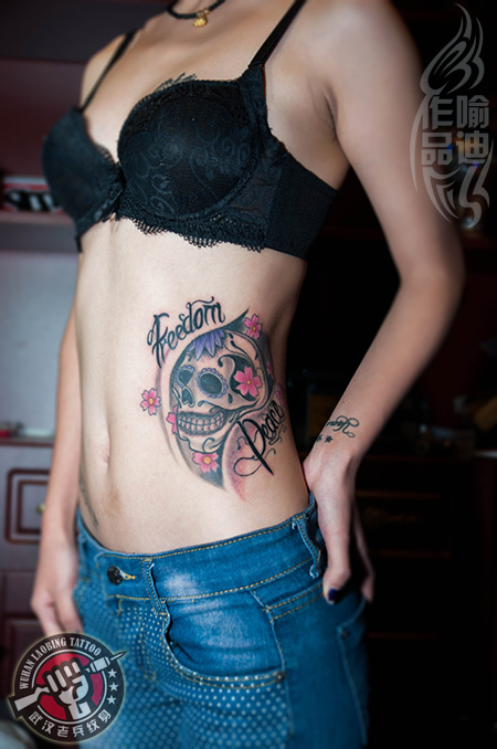 武汉最好纹身店打造的美女腹部欧美骷髅纹身作品