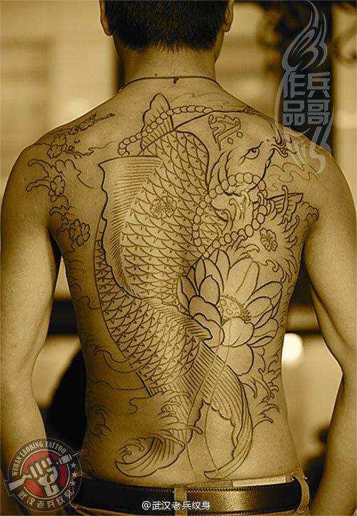 2014年武汉最好纹身店打造的满背鲤鱼纹身割线图