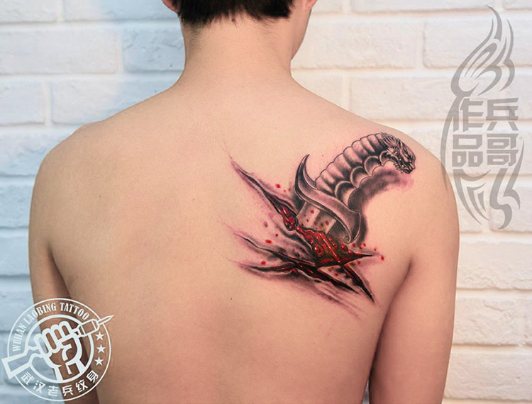 武汉最好纹身店打造的背部撕皮匕首纹身作品
