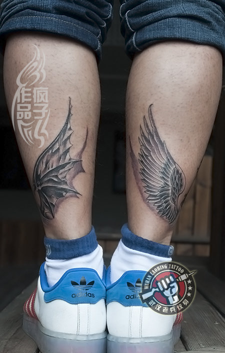 武汉专业纹身店打造的腿部天使恶魔翅膀纹身作品