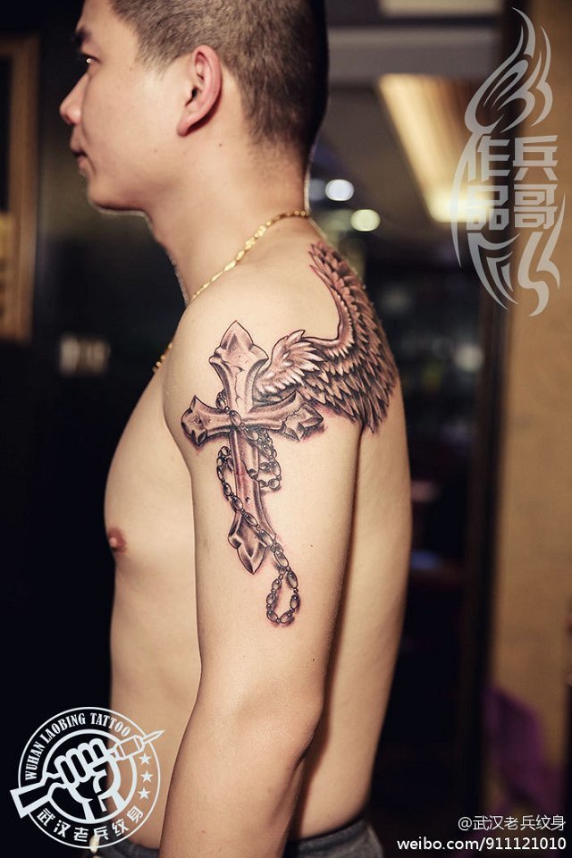 武汉最好纹身店打造的十字架翅膀纹身作品