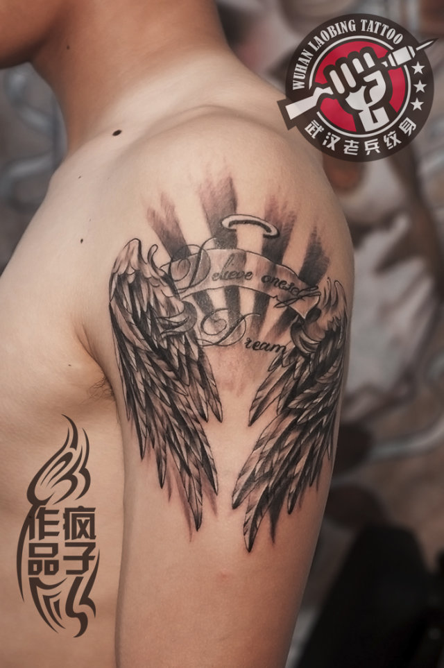 武汉专业纹身店打造的大臂翅膀纹身作品