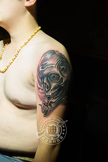 武汉最好纹身店打造的个性大臂骷髅纹身作品