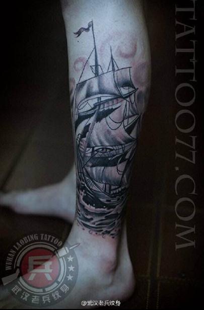 腿部帆船纹身作品
