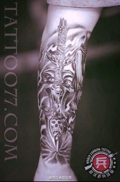 黑灰手臂树叶菩提纹身作品图案