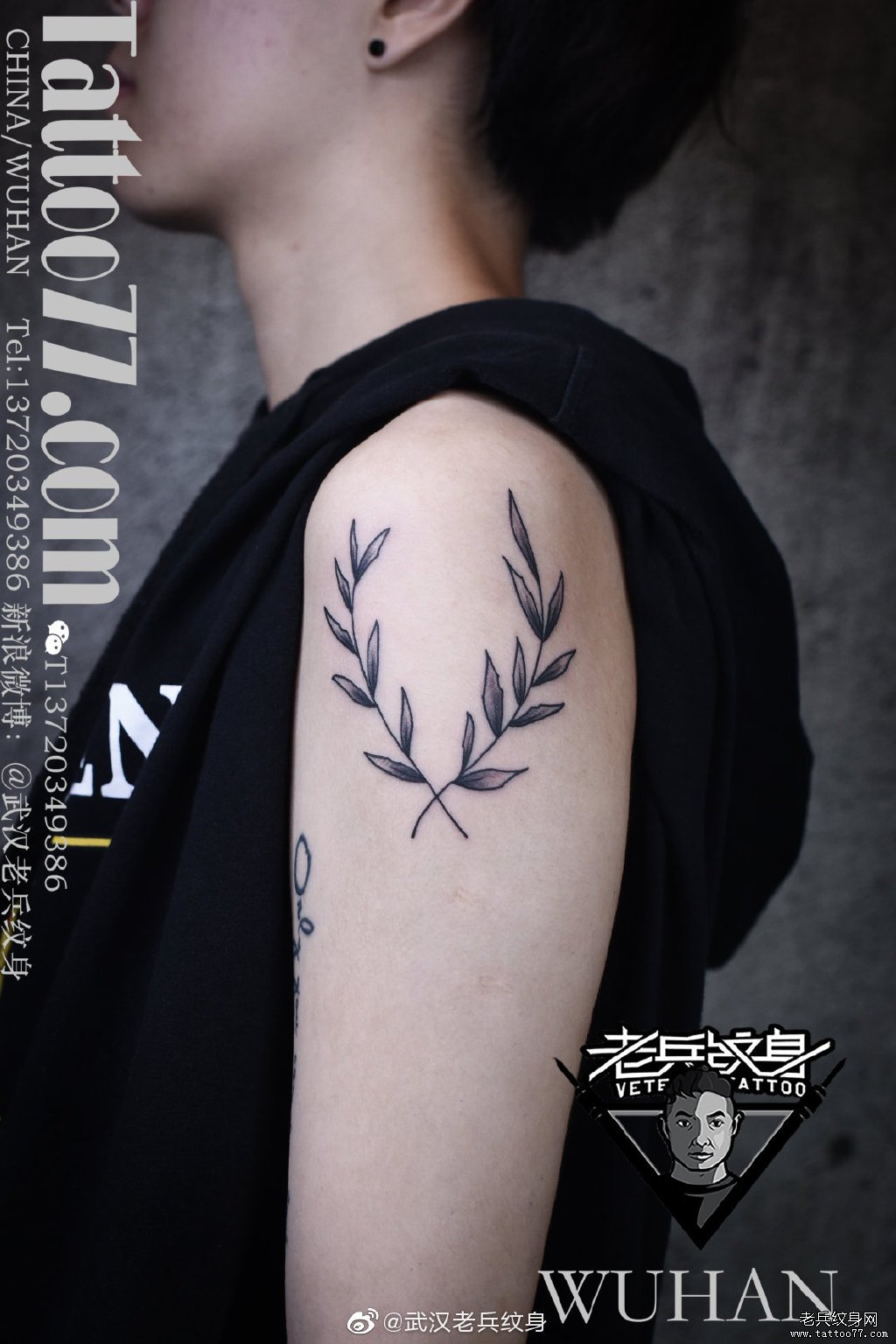 上臂树叶纹身作品