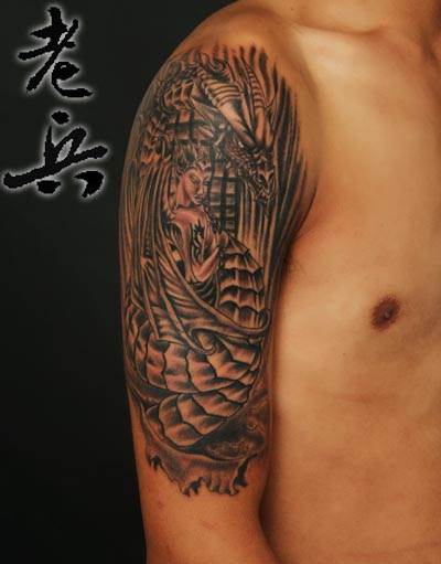 黑灰泼墨肩部文身作品