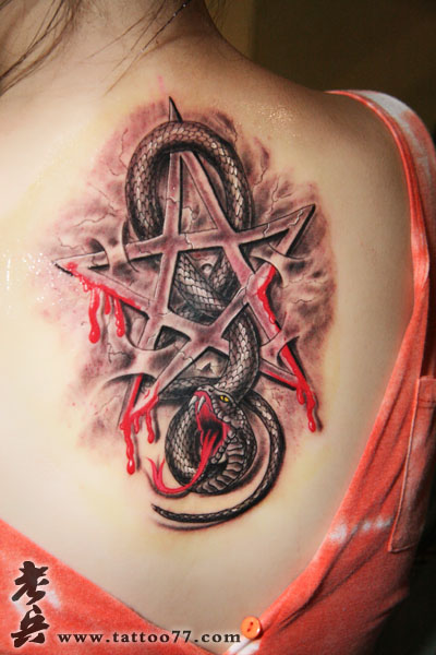 武汉纹身店:美女背部性感五芒星与蛇纹身