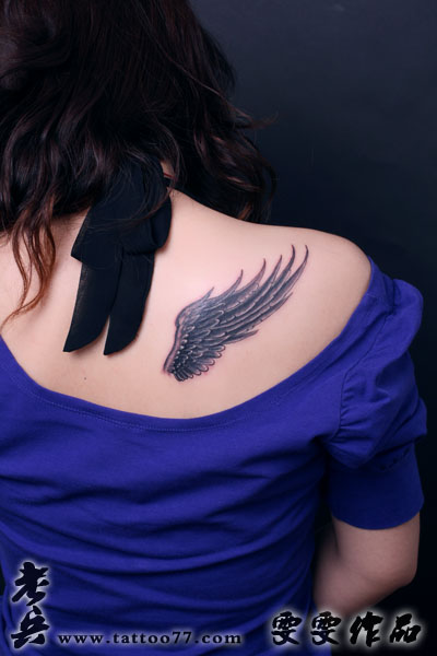 武汉纹身店:美女肩背翅膀纹身