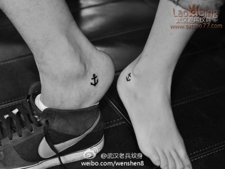 武汉最好纹身店:时尚的情侣脚部船锚纹身图案作品