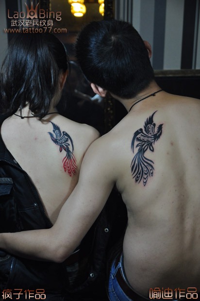 武汉专业纹身店:有爱的情侣背部图腾凤凰纹身图案作品