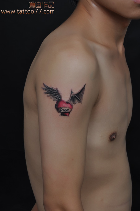 武汉专业纹身店:个性的大臂爱心翅膀纹身图案作品
