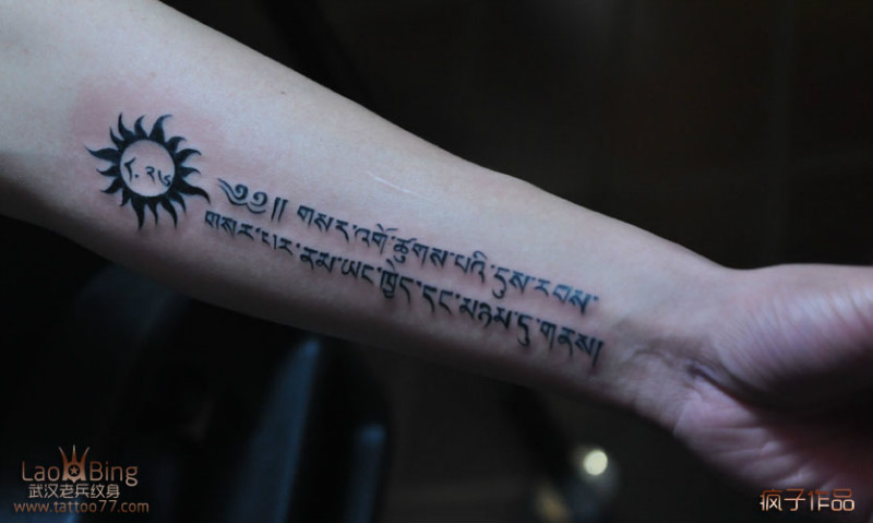 武汉专业纹身店:很有Feel的手臂太阳文字纹身图案作品