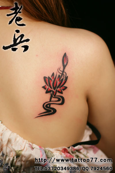 一款漂亮的女性肩背莲花图腾纹身作品图片