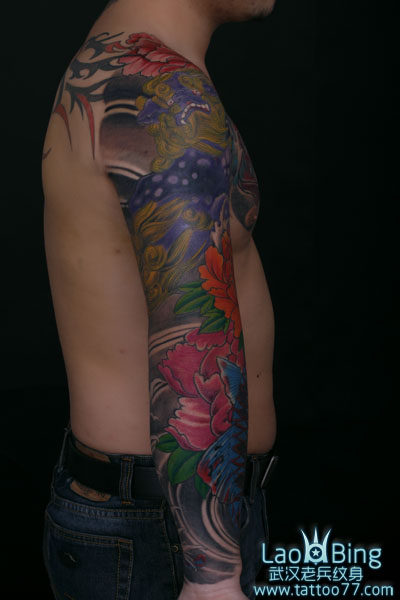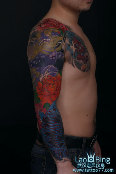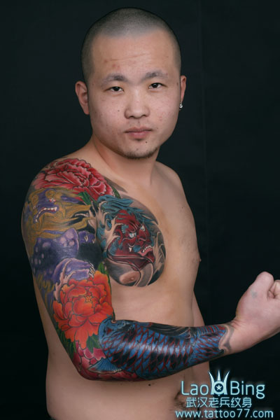 武汉专业纹身店:遮盖失败纹身--半胛花臂般若鲤鱼牡丹纹身图案作品