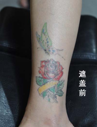 武汉专业纹身店:遮盖旧图--腿部玫瑰钻石纹身图案作品