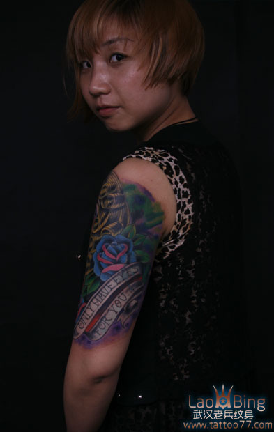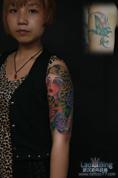 武汉专业纹身店:遮盖旧图--大臂摩登女郎纹身图案作品