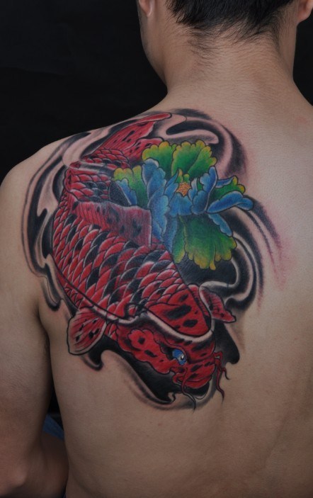武汉专业纹身店:遮盖失败纹身--后背鲤鱼纹身图案作品