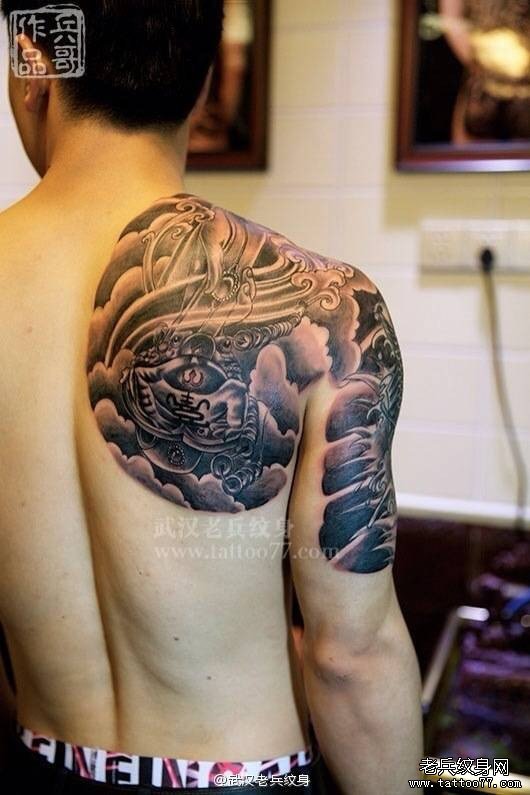 肩膀莲花鲤鱼遮盖刺青图案作品