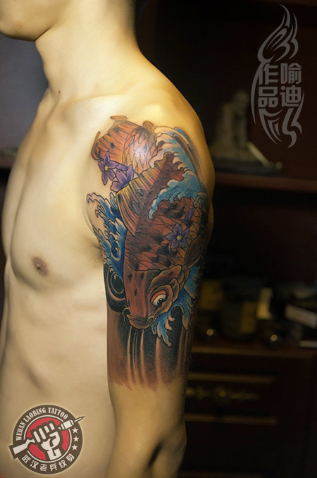 肩膀莲花鲤鱼遮盖刺青图案作品